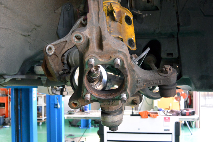 スバル車(特に寒冷地使用車)はナックルとハブの固着が非常に強いことが多く、加熱+専用プーラーが必要な場合もあります。