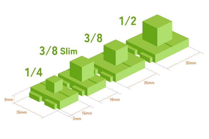 • 全ての差し込みサイズで縦幅はすべて26mm、ベース(ソケットを固定する出っ張り部分以外)の高さは8mm、ツメ部分は3mmで統一