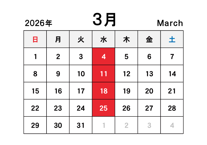 3月の定休日のご案内です3月は通常定休の水曜日のみお休みさせて頂きます