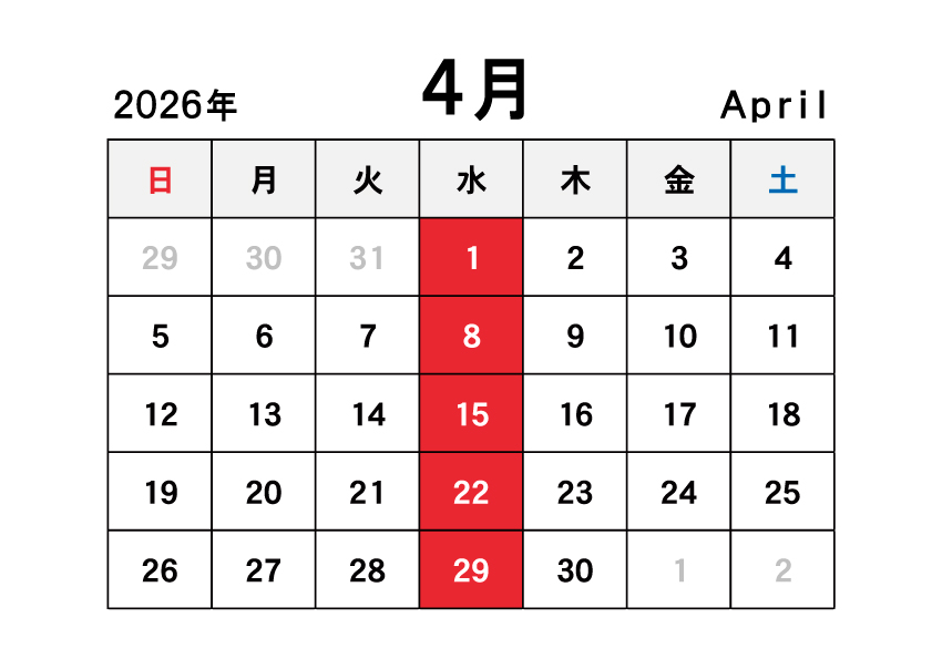 4月の定休日のご案内です4月は通常定休の水曜日のみお休みさせて頂きます